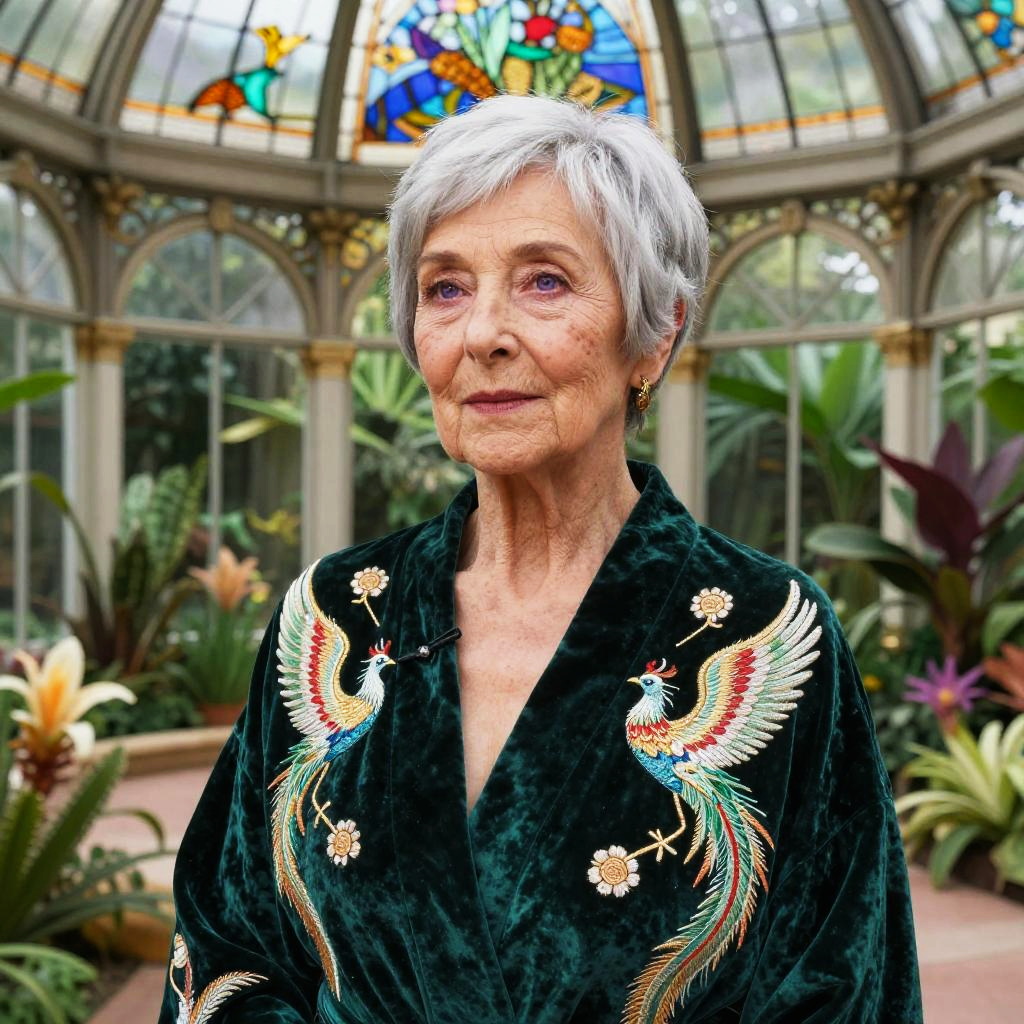 Elderly woman with a silver pixie cut and delicate freckles wearing an opulent emerald velvet kimono-style robe embroidered with phoenix motifs. She has soft violet-gray eyes and is positioned against a backdrop of ornate Art Nouveau stained-glass conservatory filled with exotic plants, exuding an air of elegance.