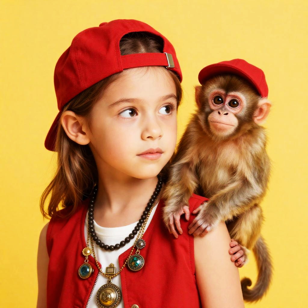 Photograph of a young girl with light skin and brown hair, wearing a red backward cap and a red vest with multiple jewelry pendants, looking to the side with a curious expression. A small monkey with light brown fur and large eyes is perched on her right shoulder, wearing a matching red cap. Bright yellow background.