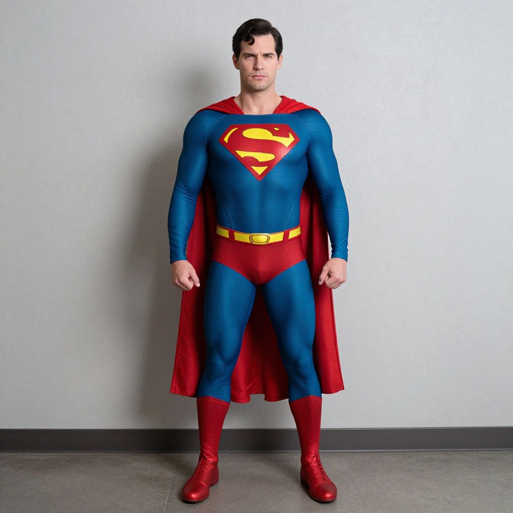 Photograph of a muscular man in full Superman costume, blue bodysuit, red cape, yellow belt, red boots, standing against plain gray wall