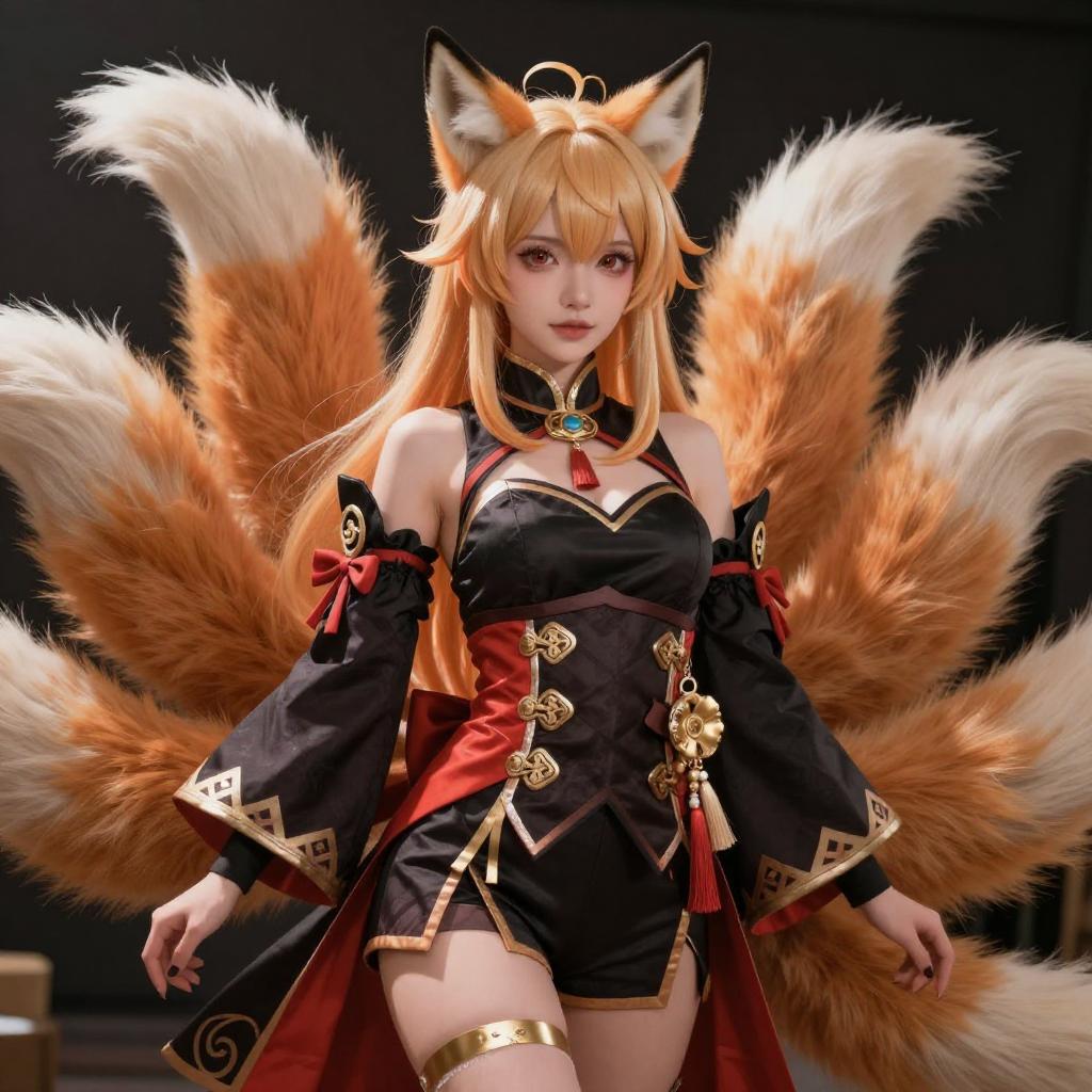 Detailed digital cosplay featuring an anime-style woman with fox ears and multiple large fluffy tails. She wears a black and red outfit with gold accents, combining traditional and modern elements, inspired by a kitsune character from Azur Lane. The high-resolution image highlights the intricate costume design and realistic textures of the fur tails and fabric.