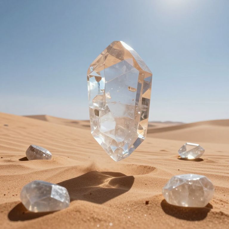 A surreal desert landscape where translucent, crystalline stones float effortlessly across the sand, casting ethereal shadows and inviting exploration into a realm of forgotten dreams.
