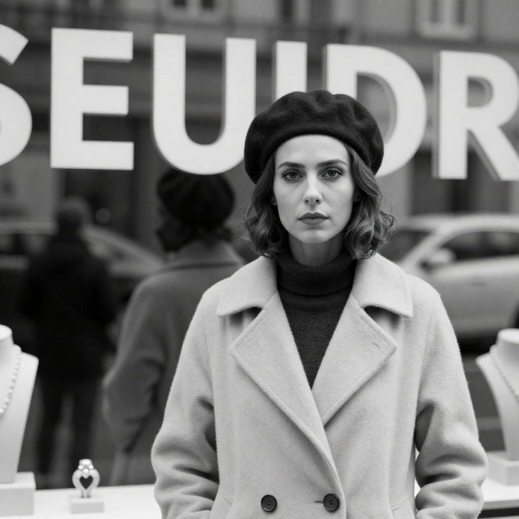 Black and white photograph. Woman in dark beret, light coat with broad collar, short wavy hair, serious expression, standing in front of jewelry store window. Reflected people and car in background. Large letters on glass window. Reflections of passersby.