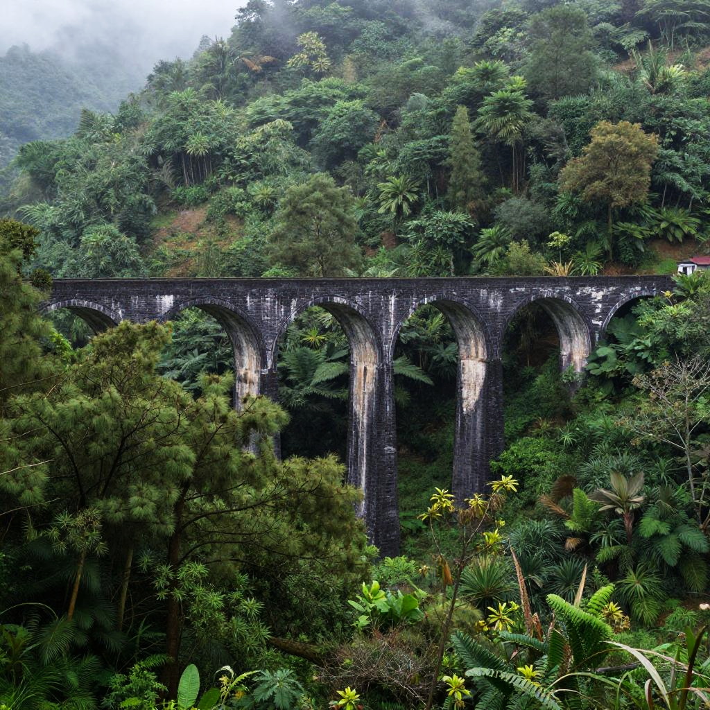 Photograph of a lush, dense tropical forest with a dark, stone, three-arched bridge spanning across the middle. The bridge, with visible arches and textured stone, stands out against the rich greenery. Tall trees, ferns, and various plants fill the foreground and background, creating a vibrant, jungle-like atmosphere. Mist or low clouds hover above the treetops, adding a sense of depth and mystery. The bridge's arches are illuminated by subtle, diffused sunlight, highlighting their structure. The overall scene is lush, verdant, and serene, with the bridge appearing as a striking architectural element amidst the natural beauty.