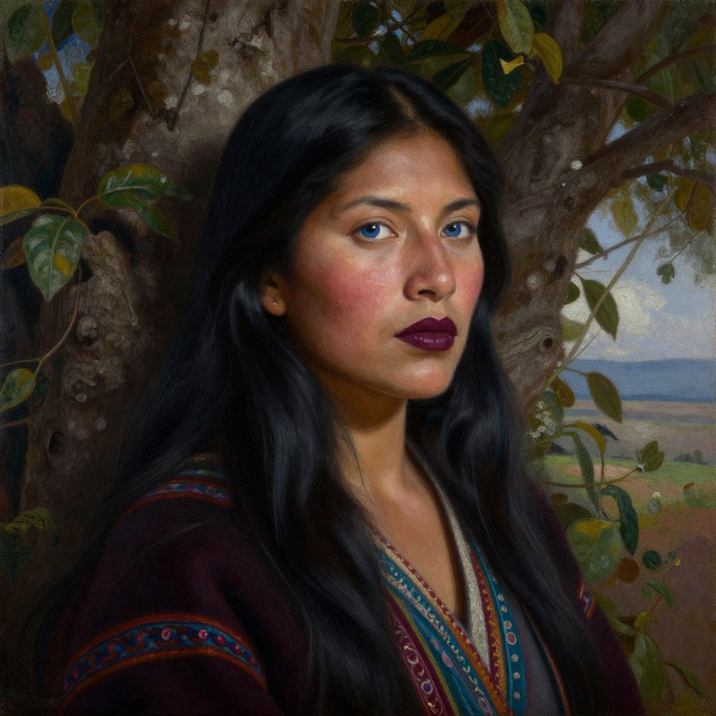 Create a hyperrealistic oil painting portrait of an Andean woman with azure eyes and burgundy lips. Soft, diffused light accentuates her delicate features, illuminating porcelain skin, and cascading through silky black hair, creating captivating shadows. Framed by lush foliage, she leans against a gnarled tree, her gaze fixed on a distant horizon, a portrait of introspection. The intricate details of her expression and the rich textures of her attire—elegant and exotic, with hints of intricate patterns—draw viewers into a narrative of adventure and transformation. Her enigmatic gaze and the interplay of light and shadow evoke a sense of mystery and allure.