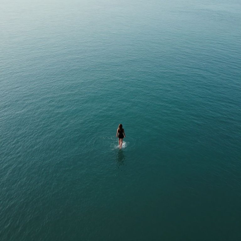 Craft an image reflecting surrealistic dreamscape aesthetics, portraying an individual standing on an endless sea in the realm of photorealistic digital art. The vantage point should offer an aerial perspective akin to a 'bug's-eye view,' capturing the unique sensation of walking upon water with ripples emanating from their feet. This evocative scene should stir feelings of solitude and contemplation, while intertwining serenity and wonder, emphasizing the dichotomy between the palpable world above and the enigmatic abyss beneath.
