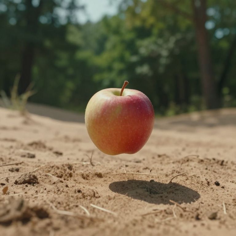 Craft an image characterized by surrealism, featuring an apple levitating above a mystifying landscape where arid dunes converge with verdant woods. The perspective is from below, emphasizing the contrast between reality and illusion as the suspended fruit casts a shadow onto the barren ground. Gentle, dreamy illumination highlights the otherworldly nature of the floating apple, instilling a sense of awe and intrigue while hinting at underlying meanings within this perplexing and intellectually stimulating visual composition.