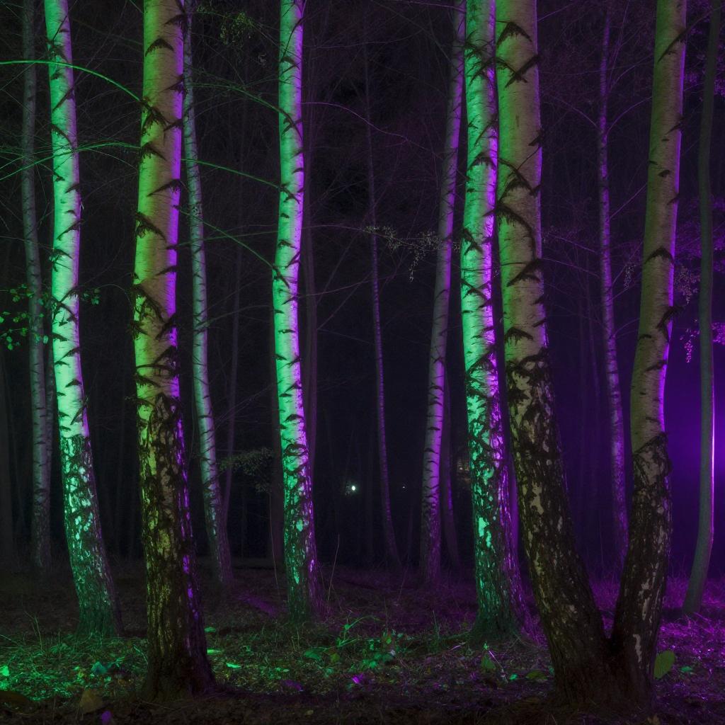 Photorealistic image of a vibrant forest at night featuring birch trees illuminated by glowing green LED lights and neon purple uplighting. The scene captures a dreamy, rave-inspired atmosphere with colorful neon gel lighting and high-definition rendering details.