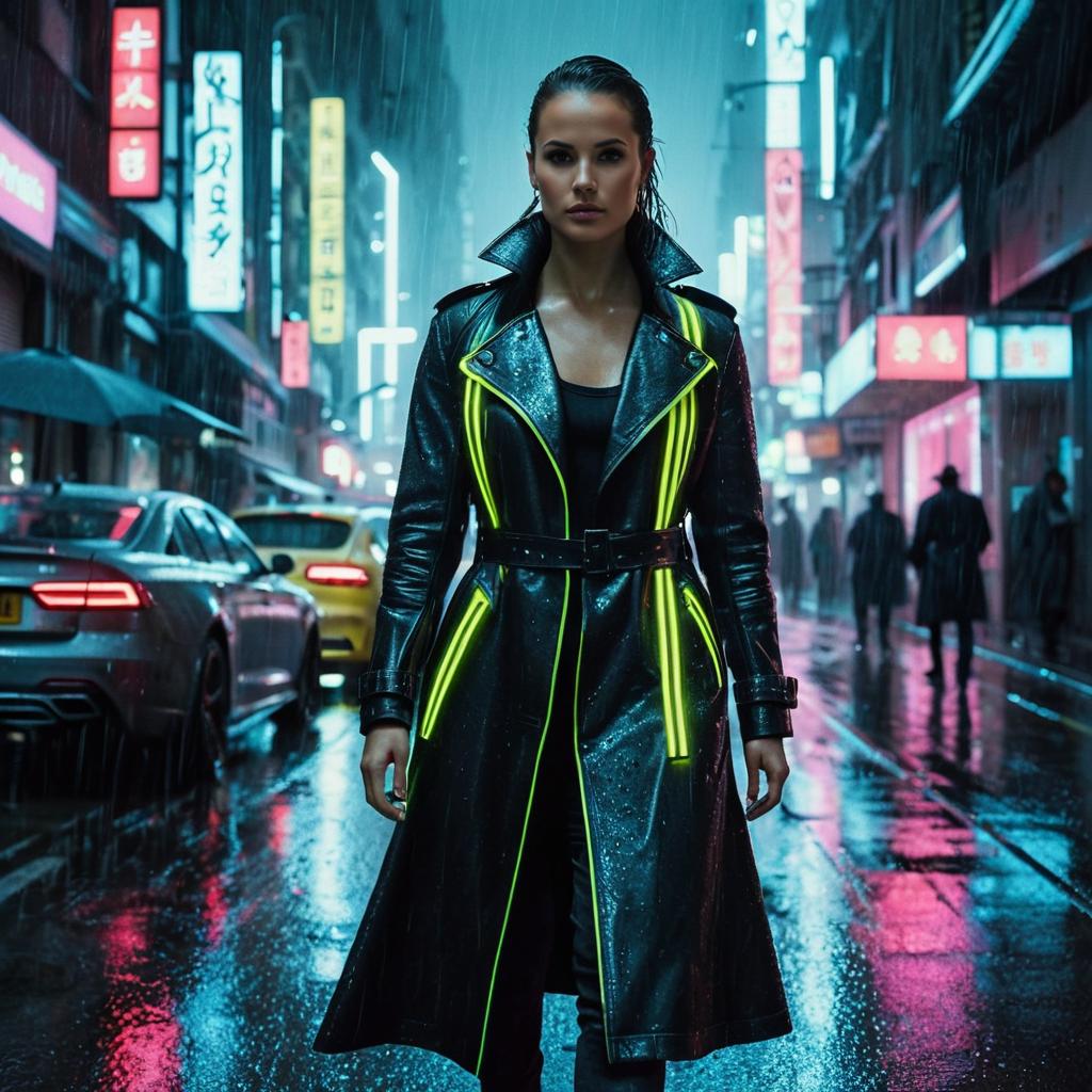 A female model styled as a cyberpunk detective wearing a black leather trench coat with neon yellow accents, standing on a rain-soaked street in a futuristic city at night. The scene features neon-lit signs and reflections on the wet pavement, with a moody, high-tech urban atmosphere. The woman has slicked-back hair and is dressed in black pants and black platform boots.