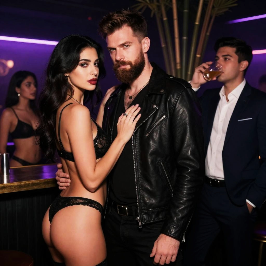 Photograph of a nightclub scene. Topless woman with curly hair, black gloves, and sparkly underwear pole dancing. Three men in suits sitting at the bar, one sipping a drink. Background has dim lighting and blurred lights.