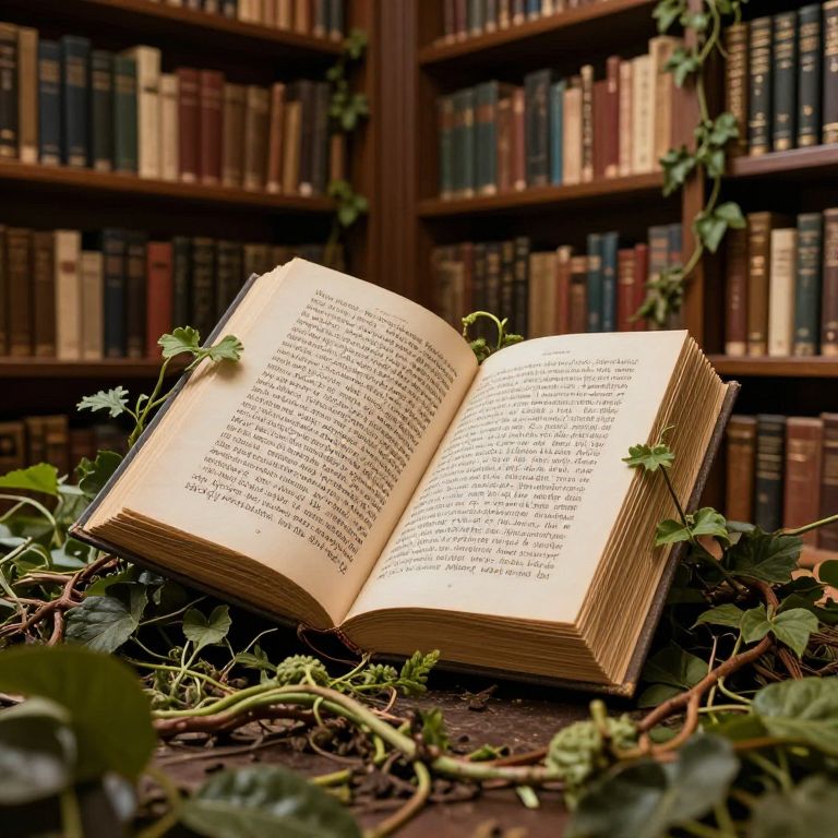 Photograph of an open book with yellowed pages, filled with black text, lying slightly askew on a dark wooden surface. The book is surrounded by green ivy leaves and vines, adding a touch of nature to the scene. In the background, there are tall wooden bookshelves filled with a variety of books, arranged both vertically and horizontally. The book's pages are thick and slightly worn, suggesting age and use. The ivy's leaves are detailed, with visible veins and a slightly glossy texture. The overall setting is warm and inviting, with rich brown and green hues dominating the image.