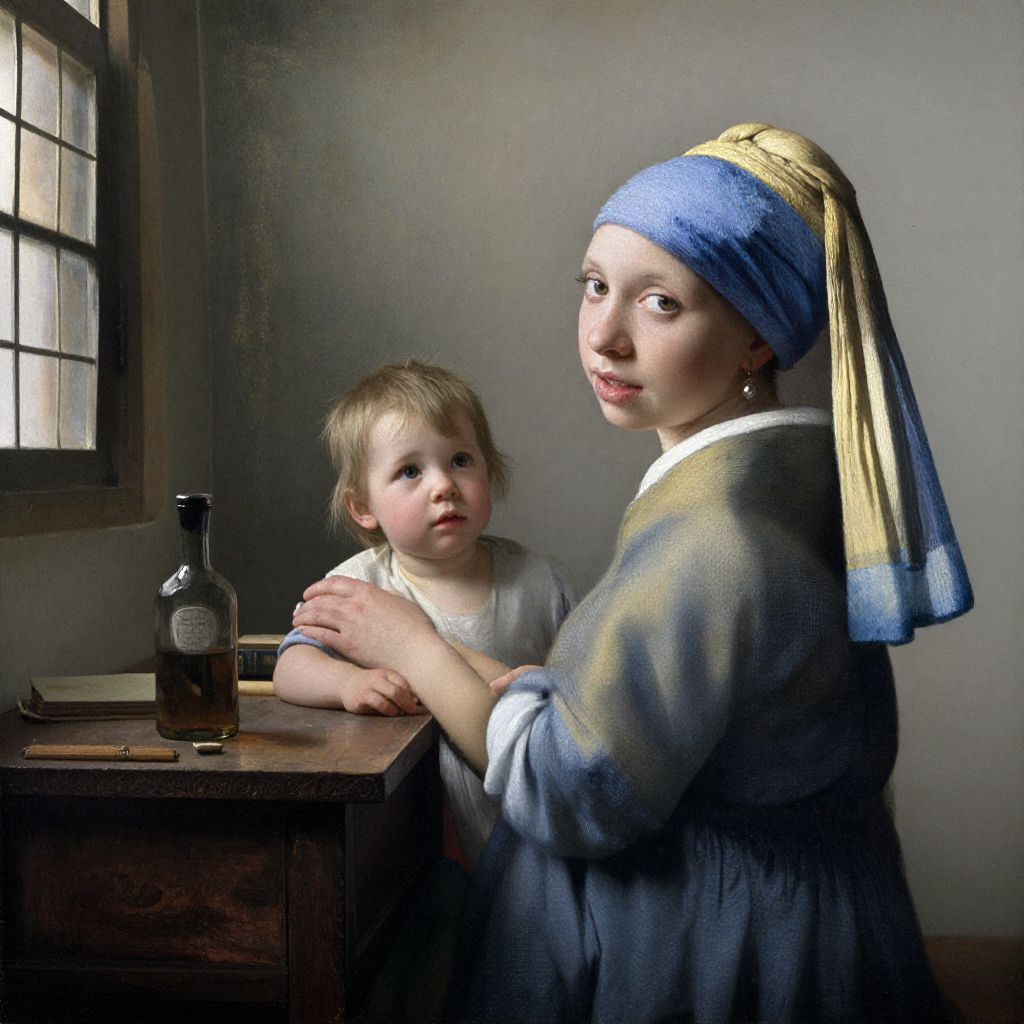Photorealistic digital painting of a 17th-century woman in blue dress and headscarf, standing beside a young boy at a wooden table with