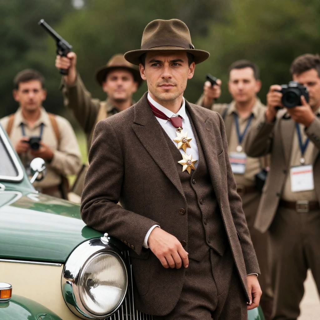 Photograph of four men in Western attire, foreground man in blue suit, black hat, reading red book, intense expression. Background: man in green jacket, black hat, sitting, man in yellow jacket, blue hat, standing, man in red jacket, black hat, standing. Town setting with wooden building, horse.