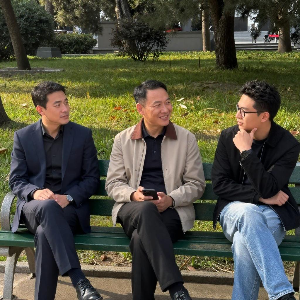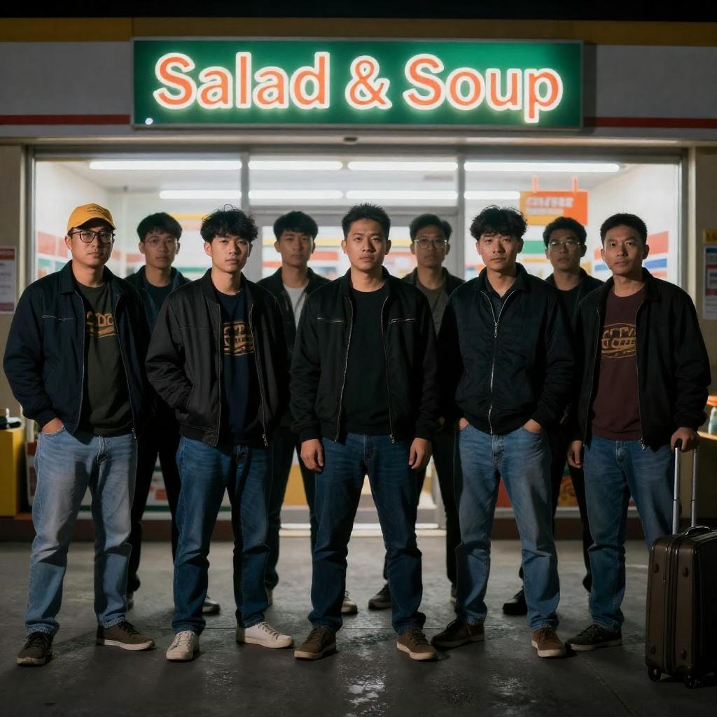 Four men walking on a suburban street. Wearing blue jackets, jeans, and casual shoes. Tall man in center, others shorter. Autumn trees in background, stop sign on right. Curved road, streetlights. Men with neutral expressions. Sunlight filtering through trees.