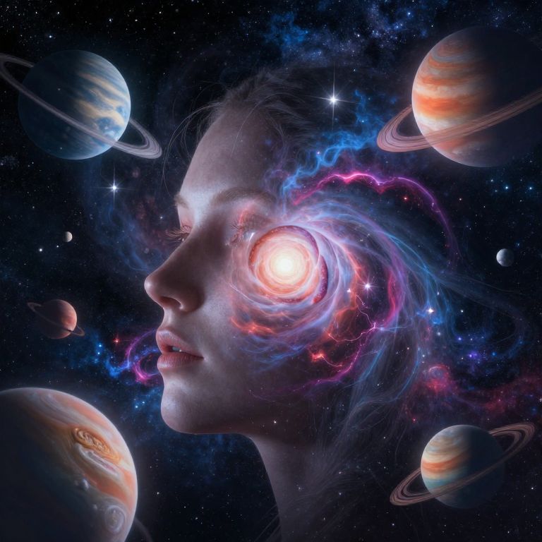 A cosmic horror scene with a person's face merging with a starry sky, filled with planets and vibrant colors.