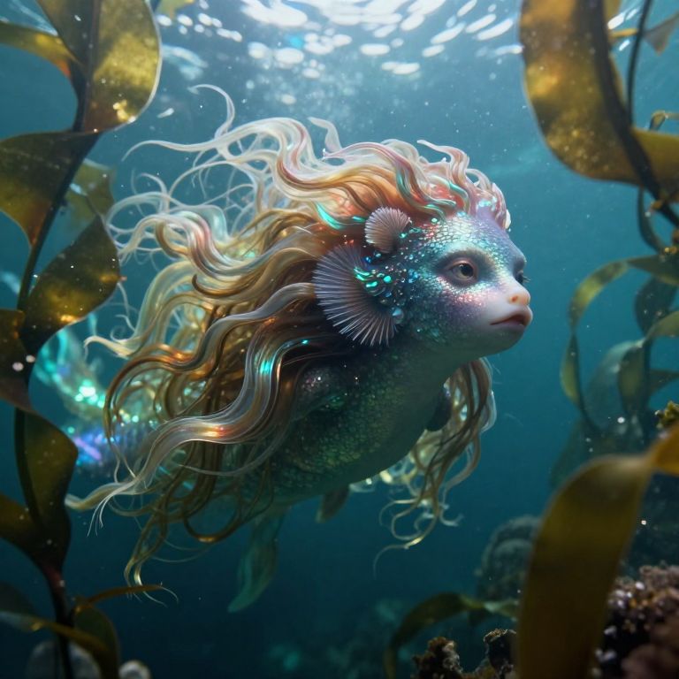 An enchanting underwater portrait in an ethereal style reminiscent of John William Waterhouse, capturing a mythical sea creature with flowing tresses akin to cascading seaweed, her delicate features illuminated by shimmering light filtering through kelp forests from an unexpected 'bug's-eye view'. This unique perspective reveals intricate details of iridescent scales and translucent gills that harmonize with the serene yet mysterious atmosphere, inviting viewers to immerse themselves in this captivating fusion of fantasy and natural beauty.