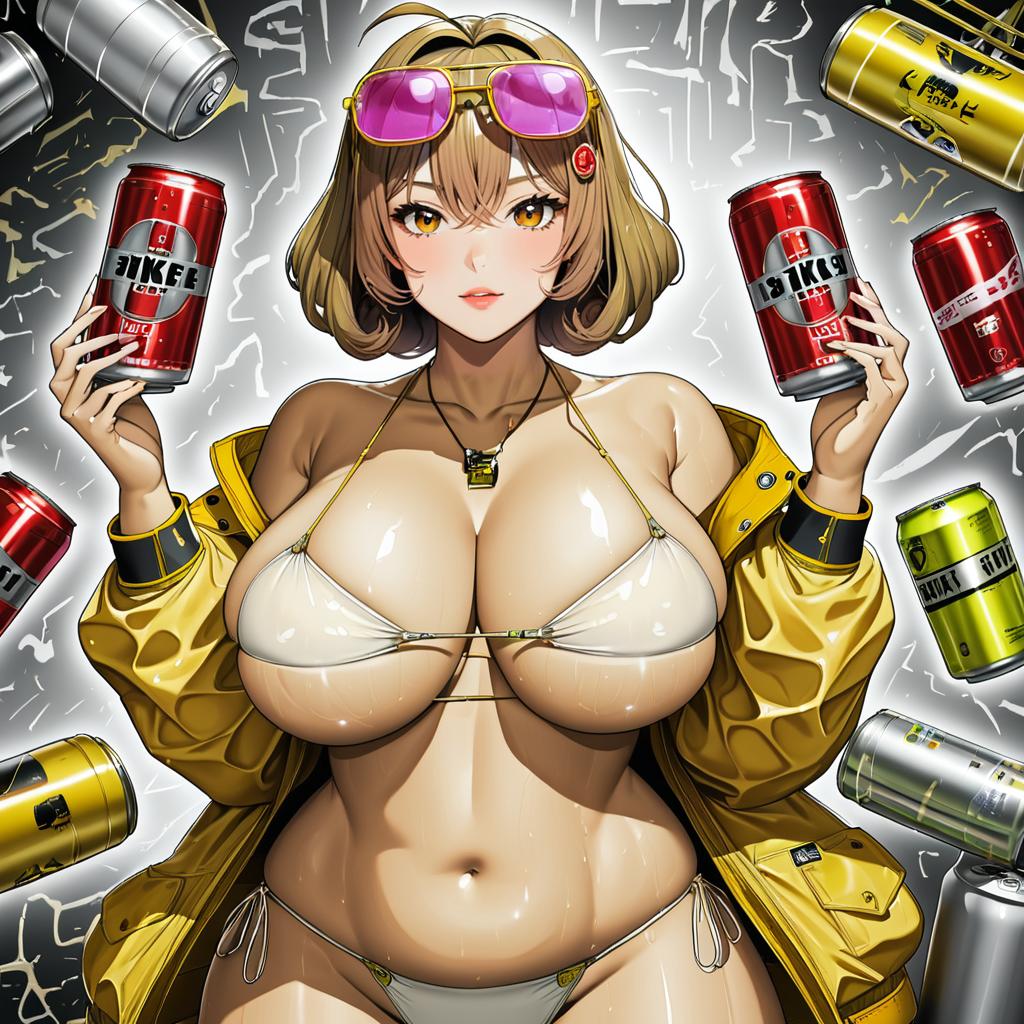 Digital illustration of an anime-style female character with short brown hair and yellow eyes. She wears a white eyepatch bikini and a yellow jacket draped over her shoulders, accessorized with pink-tinted sunglasses on her head and a necklace. The character holds red soda cans in both hands with several beverage cans floating around her against a vibrant background.