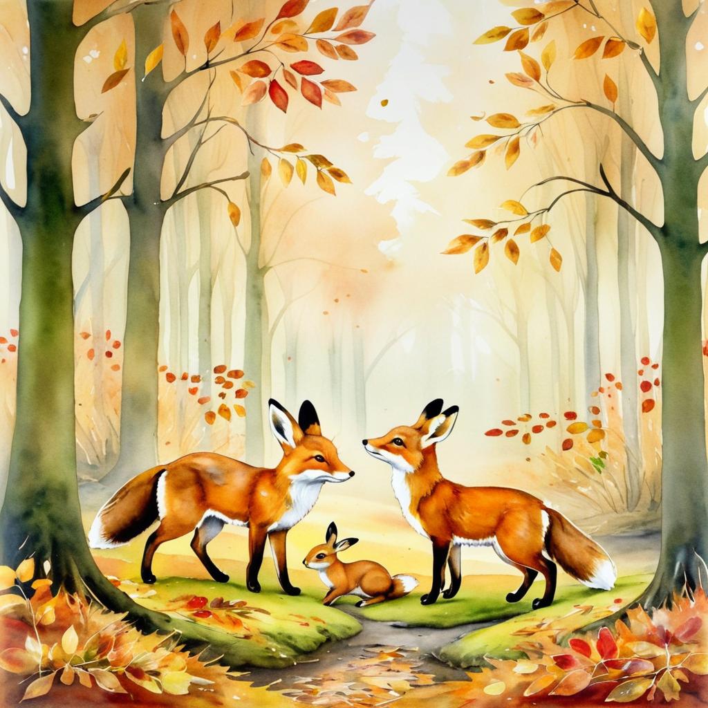 A painting of a fox and a hare with autumn leaves in a tranquil forest, by Beatrix Potter.