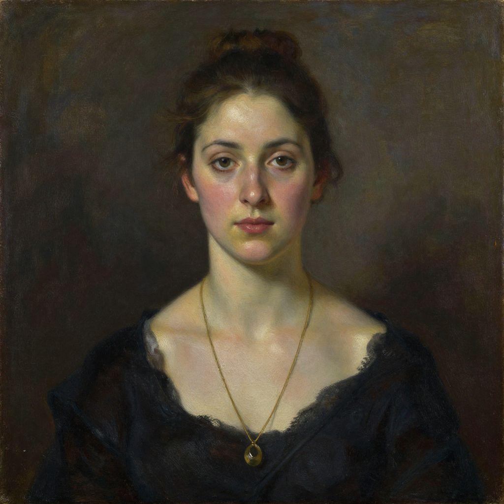 Classical portrait painting of a fair-skinned woman with dark hair in an updo, wearing an off-shoulder dark dress and gold necklace,
