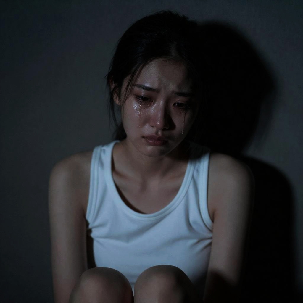 Portrait of a young Asian woman sitting indoors against a dark wall, crying with tears streaming down her face. She wears a white sleeveless top and has a sorrowful, gloomy expression with her head bowed. The lighting is low-key and cold, creating deep shadows and highlighting her authentic skin texture.