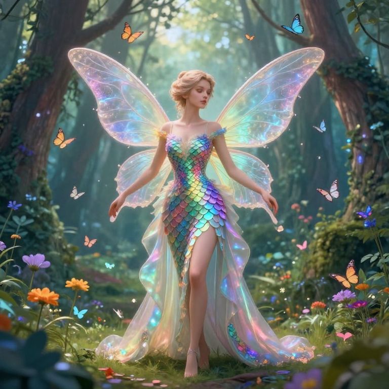 A graceful fairy stands amidst a vibrant, enchanted forest, her ethereal wings shimmering in the soft light. Dressed in a breathtaking gown adorned with colorful scales and surrounded by fluttering butterflies, she embodies the essence of magic and wonder in this captivating illustration.