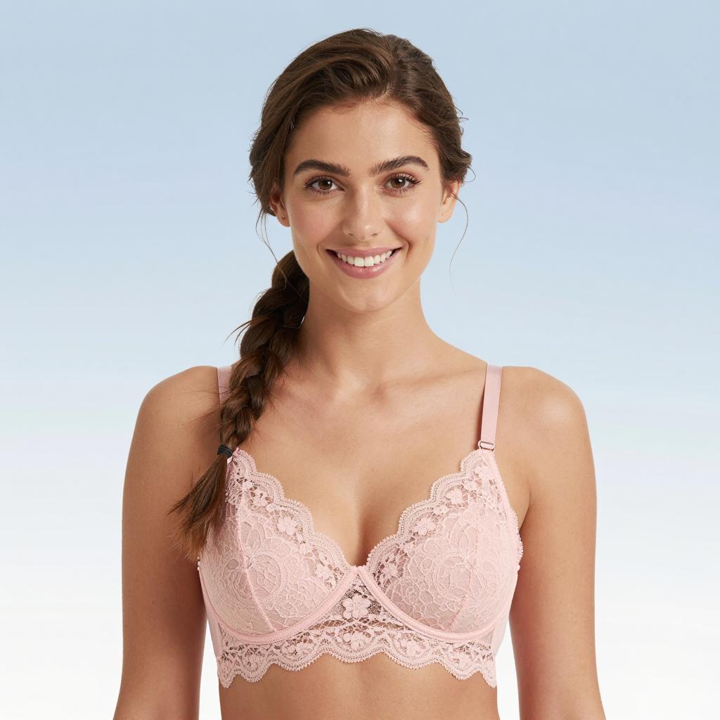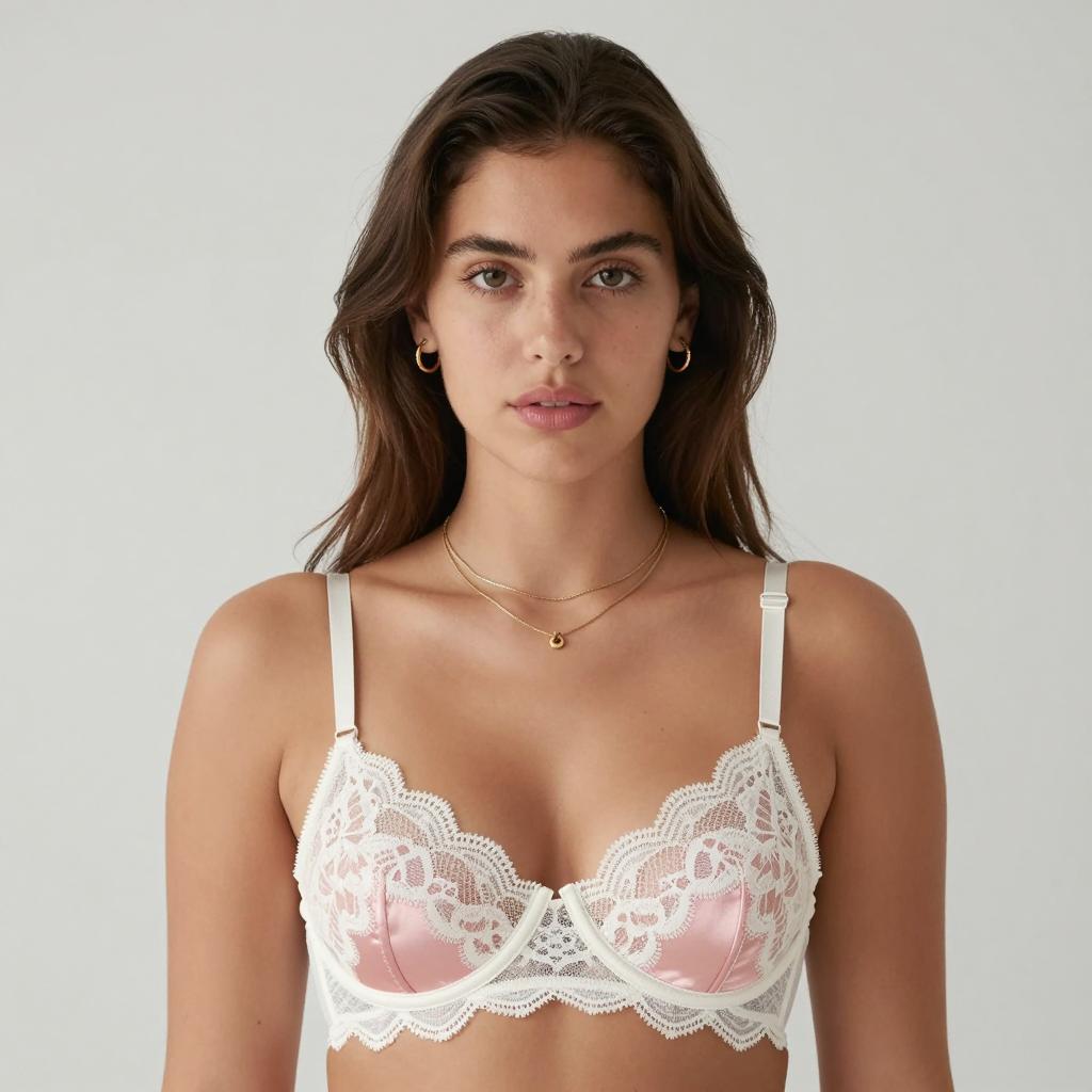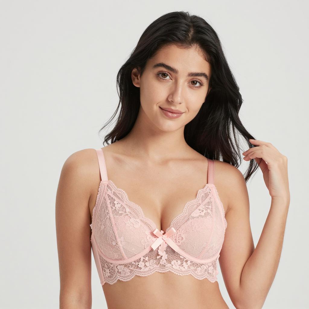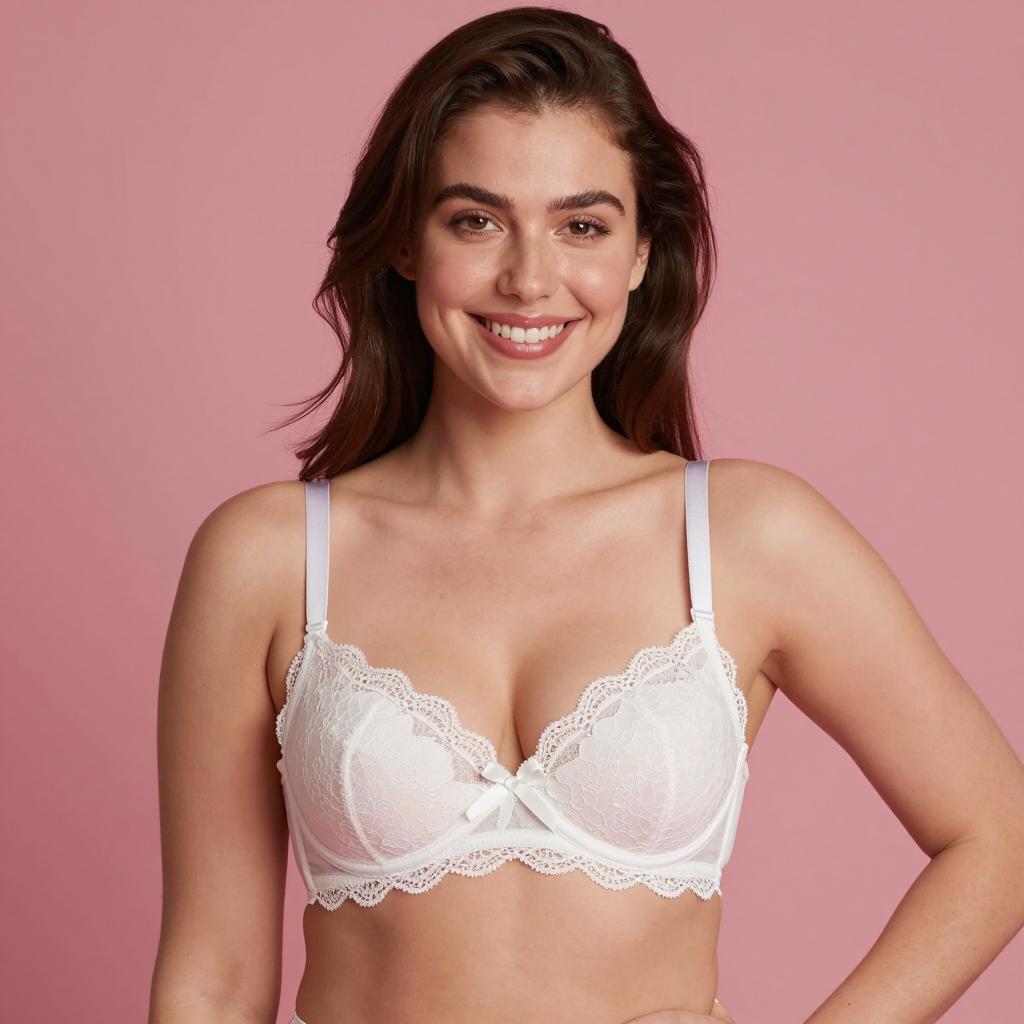 Woman with long dark hair, winking and smiling, pointing directly at the camera. She wears a floral lace bra with white lace trim. Pink background. Her teeth are visible, and she has a playful expression. Her right arm is extended forward.
