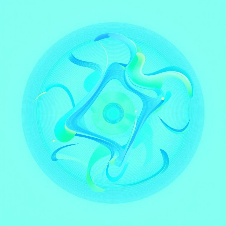 This is a digital abstract artwork featuring a glowing, circular pattern on a bright blue background. The design comprises flowing, curved lines in varying shades of blue, with hints of green and yellow, creating a sense of movement and energy. At the center of the circle is a small, bright blue dot, surrounded by the swirling lines, giving the impression of a radiant, luminescent effect. The overall texture is smooth and fluid, with a luminous quality that suggests light or energy emanating from the center. The style is reminiscent of futuristic or cosmic art.