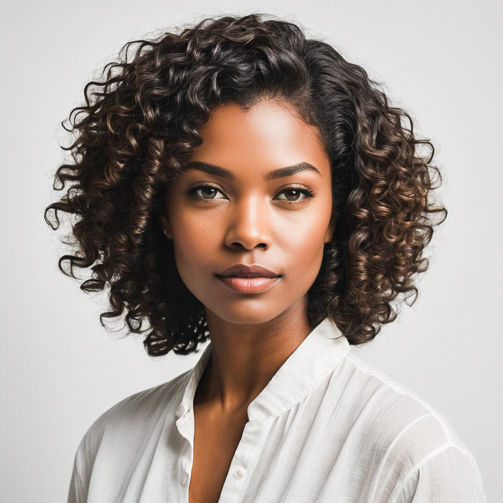 High-resolution studio portrait of a confident Black woman with warm brown skin and short, voluminous curly hair. She wears a white shirt and poses against a clean white background with a contemplative expression. The image features detailed texture of skin and hair, with soft studio lighting emphasizing natural beauty and calm presence.