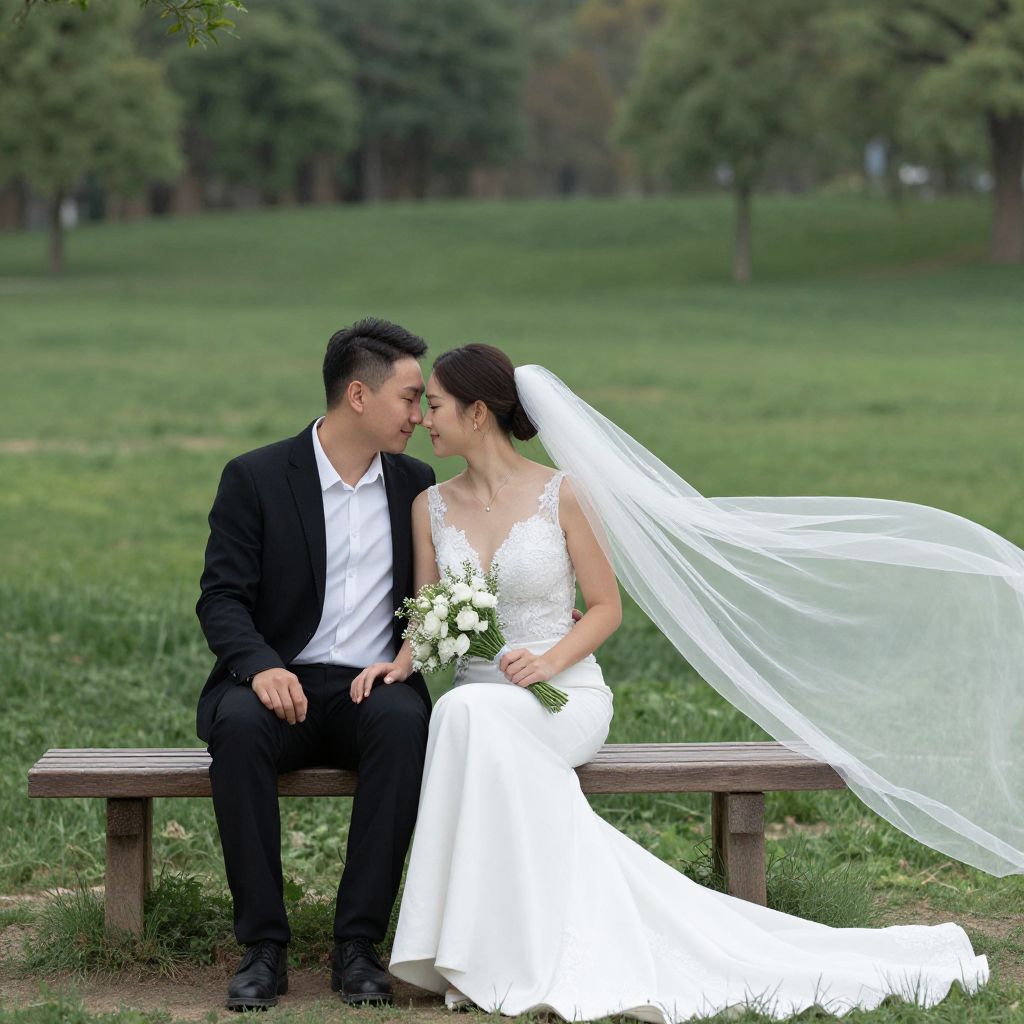 Man and woman, just married, sit closely together on a wooden bench in a serene, green park, with the bride's flowing white veil trailing behind her as she holds a bouquet of delicate white flowers.