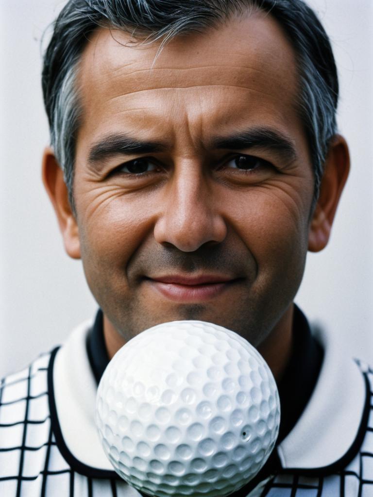 Close-up portrait of a middle-aged man with salt-and-pepper hair smiling gently while wearing a large golf ball costume headpiece and a black and white checkered shirt. The image has a humorous and photorealistic style.