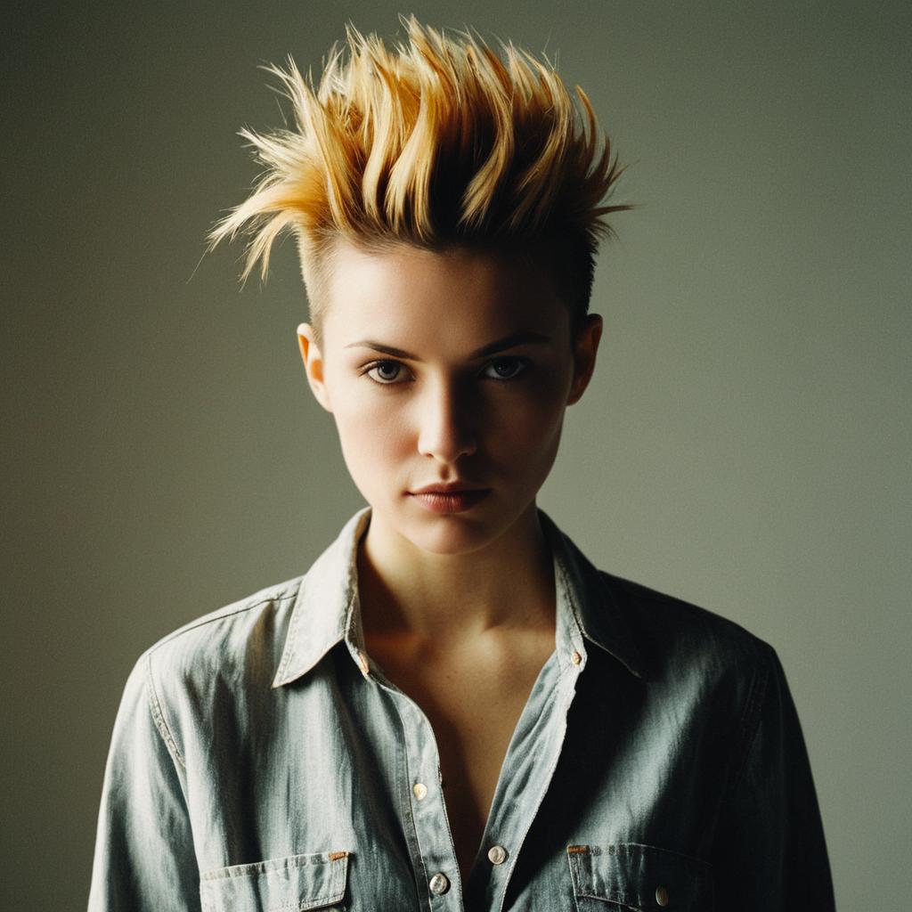 Faux Hawk hairstyle on female model, wearing casual shirt, in photo studio, captured in fashion editorial style with soft golden hour.