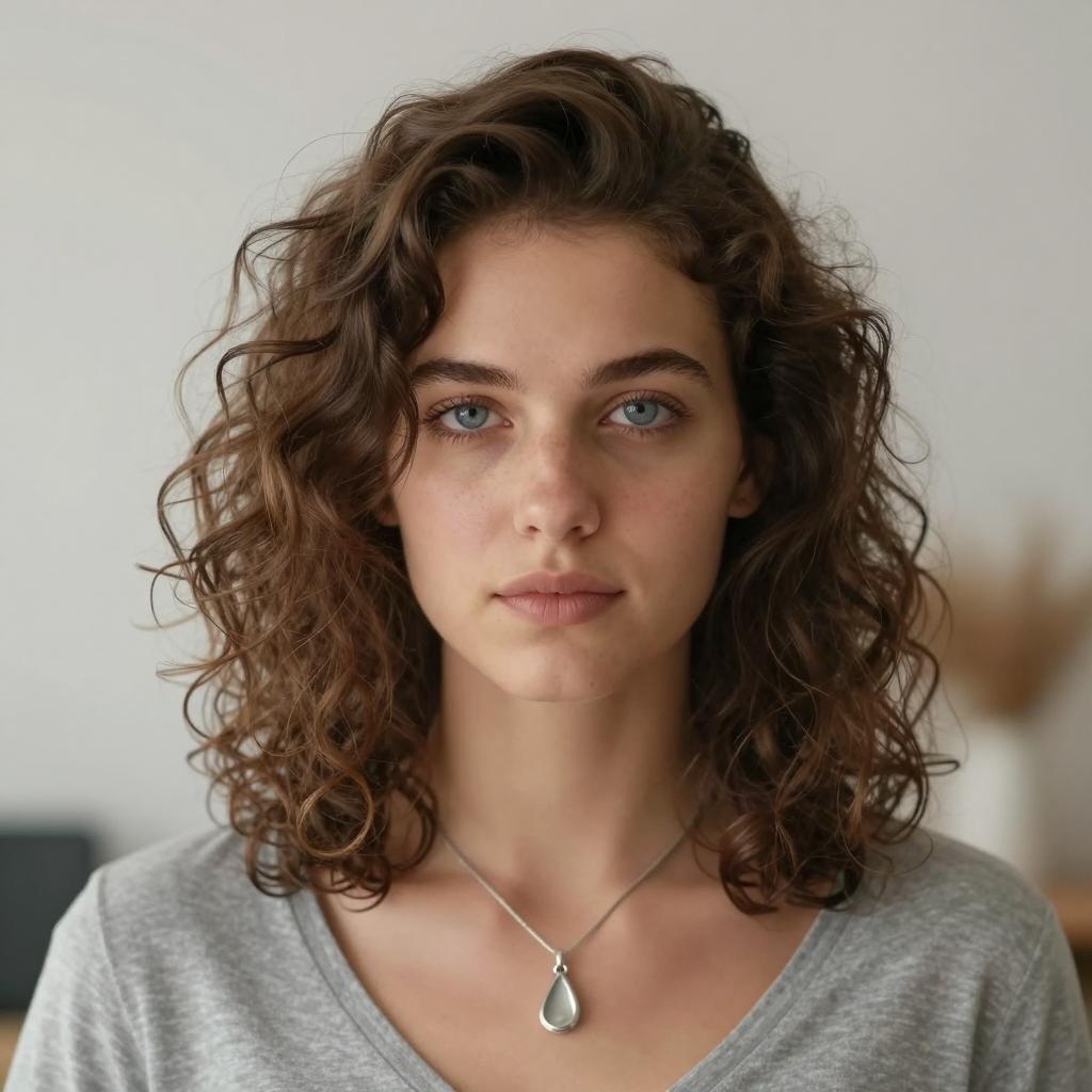 Wavy hair cut woman, photorealistic portrait of a young woman, curly brown hair, blue eyes, wearing a grey V-neck shirt, silver necklace with teardrop pendant, soft light, blurred background, realistic ures, detailed hair strands, calm expression, close-up, shallow depth of field, natural makeup, soft focus, realistic lighting, studio shot