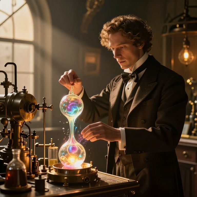 In a Victorian-inspired laboratory bathed in dramatic golden-hour lighting, a scientist dressed in formal attire interacts with a steampunk-style apparatus that transforms ethereal light into glowing, jelly-like spheres, evoking a surreal and otherworldly atmosphere reminiscent of cyberpunk aesthetics.