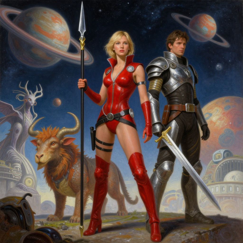 A detailed, high-resolution painting depicts a futuristic sci-fi scene with a woman in a red outfit holding a spear, a man in armor with a sword, and fantastical creatures, set against a backdrop of planets and stars, reminiscent of works by James Jean, Todd Schorr, and other artists.