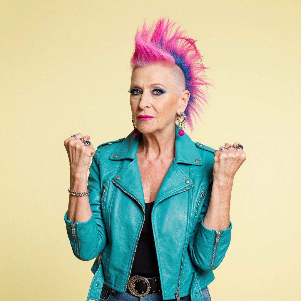 In this vibrant and dynamic image, a punk-styled elder woman commands attention with her striking pink and blue mohawk, which stands out against the bright pastel yellow background. She is dressed in a teal leather jacket, adding a touch of edginess to her outfit, and her face is adorned with bold makeup, including blue eyeshadow and pink lipstick. The woman's hands are clenched into fists, and she is wearing multiple rings on her fingers, enhancing her punk aesthetic. The lighting is cinematic, with a 16k HD quality that highlights the intricate details of her clothing and accessories. The overall composition is balanced, with the woman positioned centrally, and the background providing a stark contrast that accentuates her vibrant appearance. The image is shot in a studio setting, with a wide-angle lens capturing the full body of the subject, creating a sense of depth and perspective.