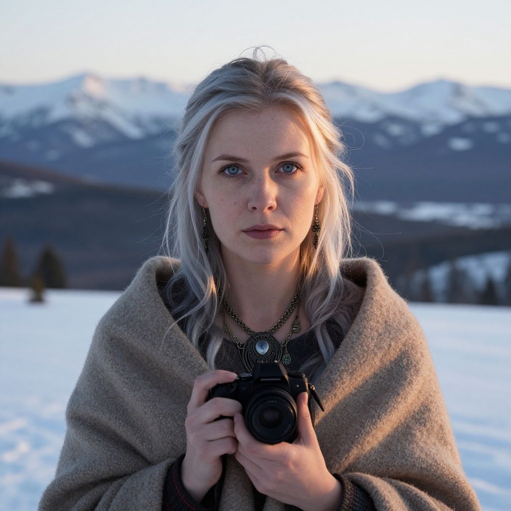 Photograph of a blonde woman with fair skin, blue eyes, and wearing a brown wool cloak, holding a camera in a snowy mountain landscape at sunset