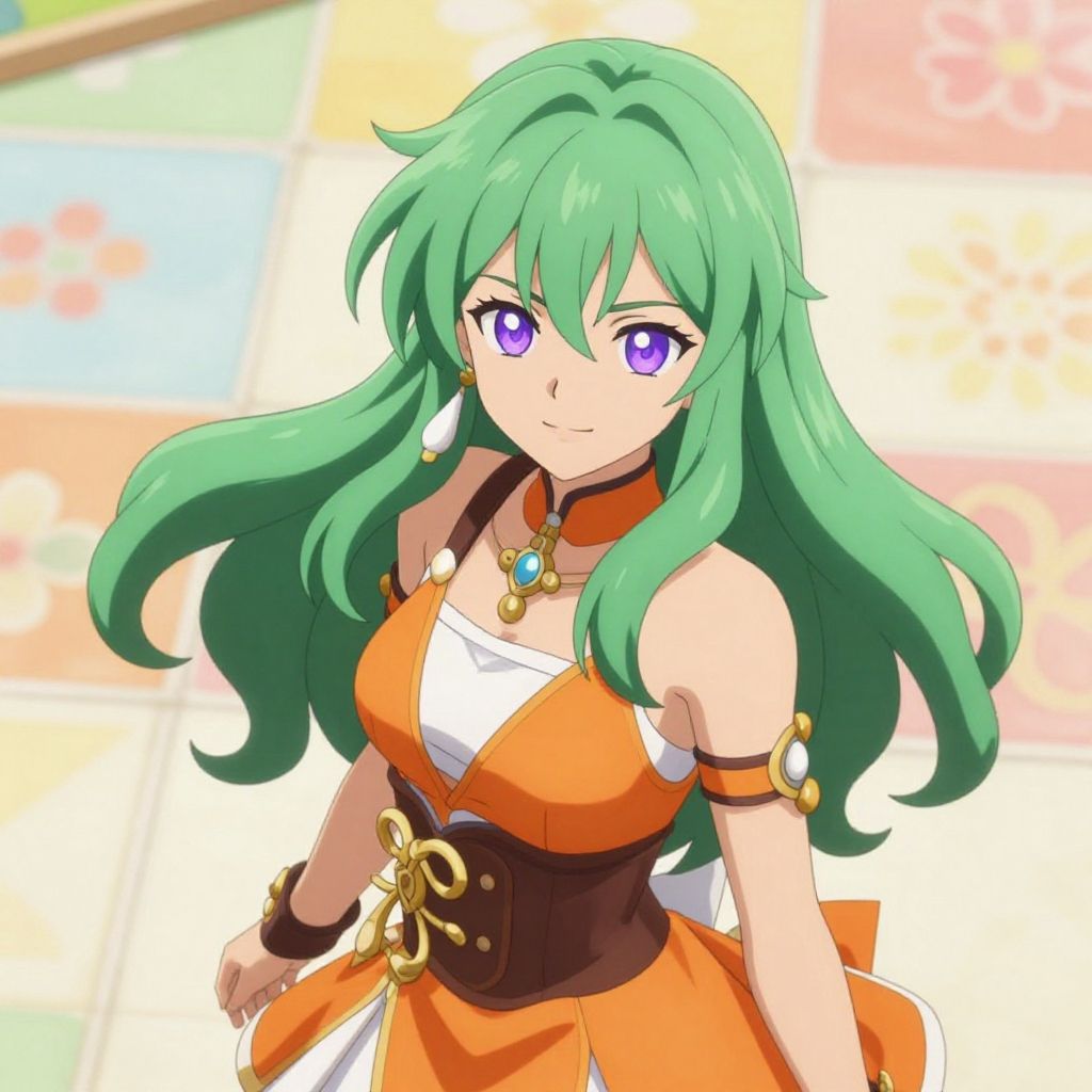 Stylized anime illustration of a confident young woman with long flowing green hair and violet eyes. She is wearing an orange and white outfit with golden accessories, including earrings and bracelets. The colorful background features soft floral patterns on a tiled surface.