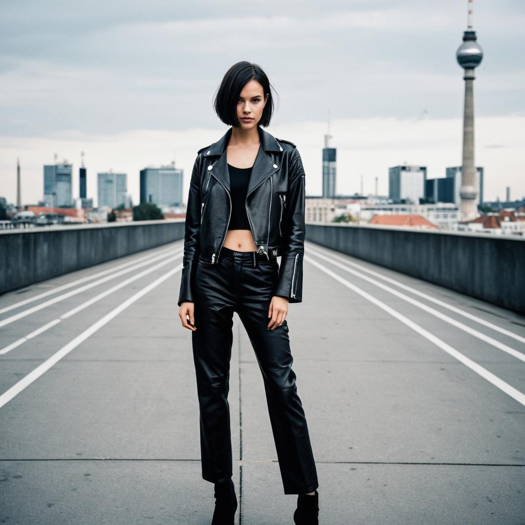 Fashion model in a Paris runway, with city landscape in background, wearing a formal suit, striking a pose, sleek bob haircut, short pixie cut, high contrast photography, hyper-resolution