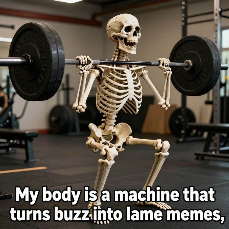 A realistic gym background with a semi-realistic skeleton viewed from the side, squatting with a barbell, Barbell is on the skeleton's shoulders, Zoom in on skeleton, The skeleton has its mouth open as if in effort, At the bottom of the image there are meme letters spelling out \"My body is a machine that turns buzz into lame memes, ” The text should be in bold, clear letters, prominently displayed to be legible and integrated into the scene