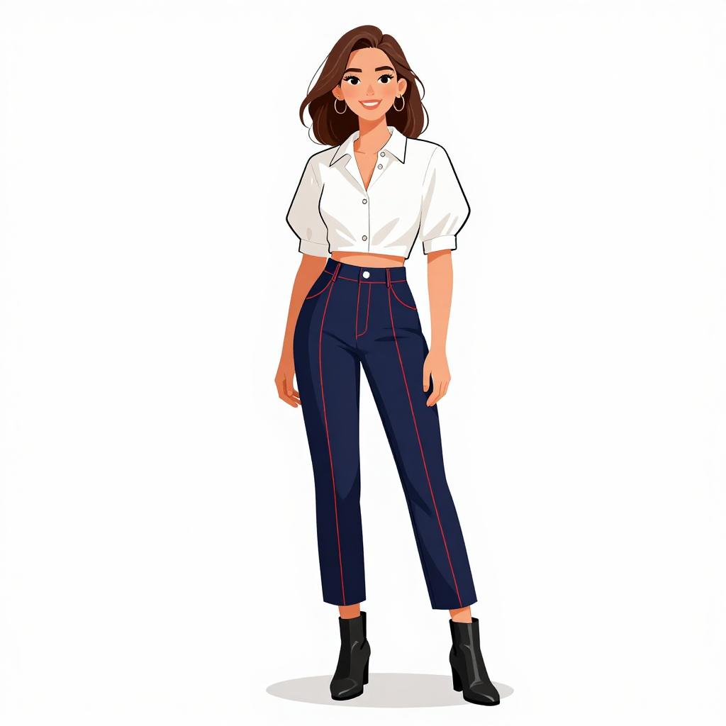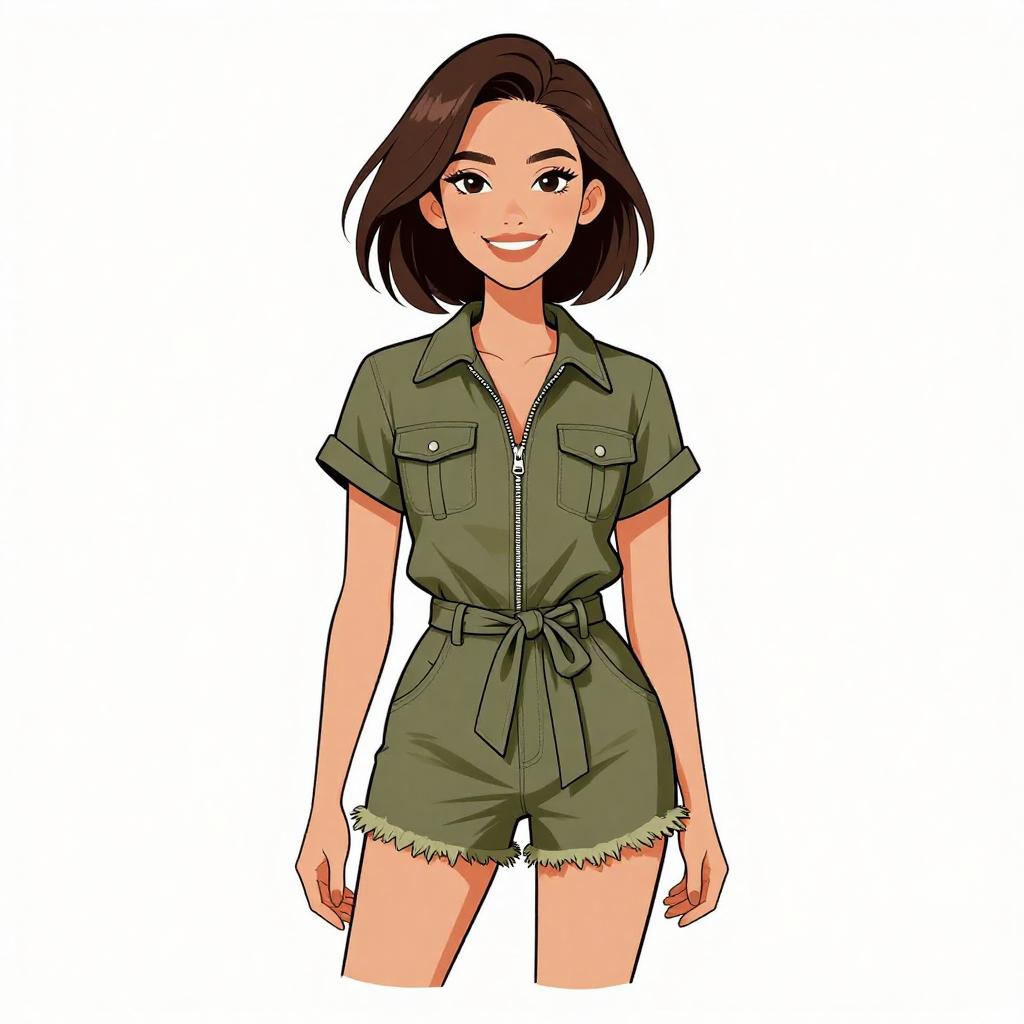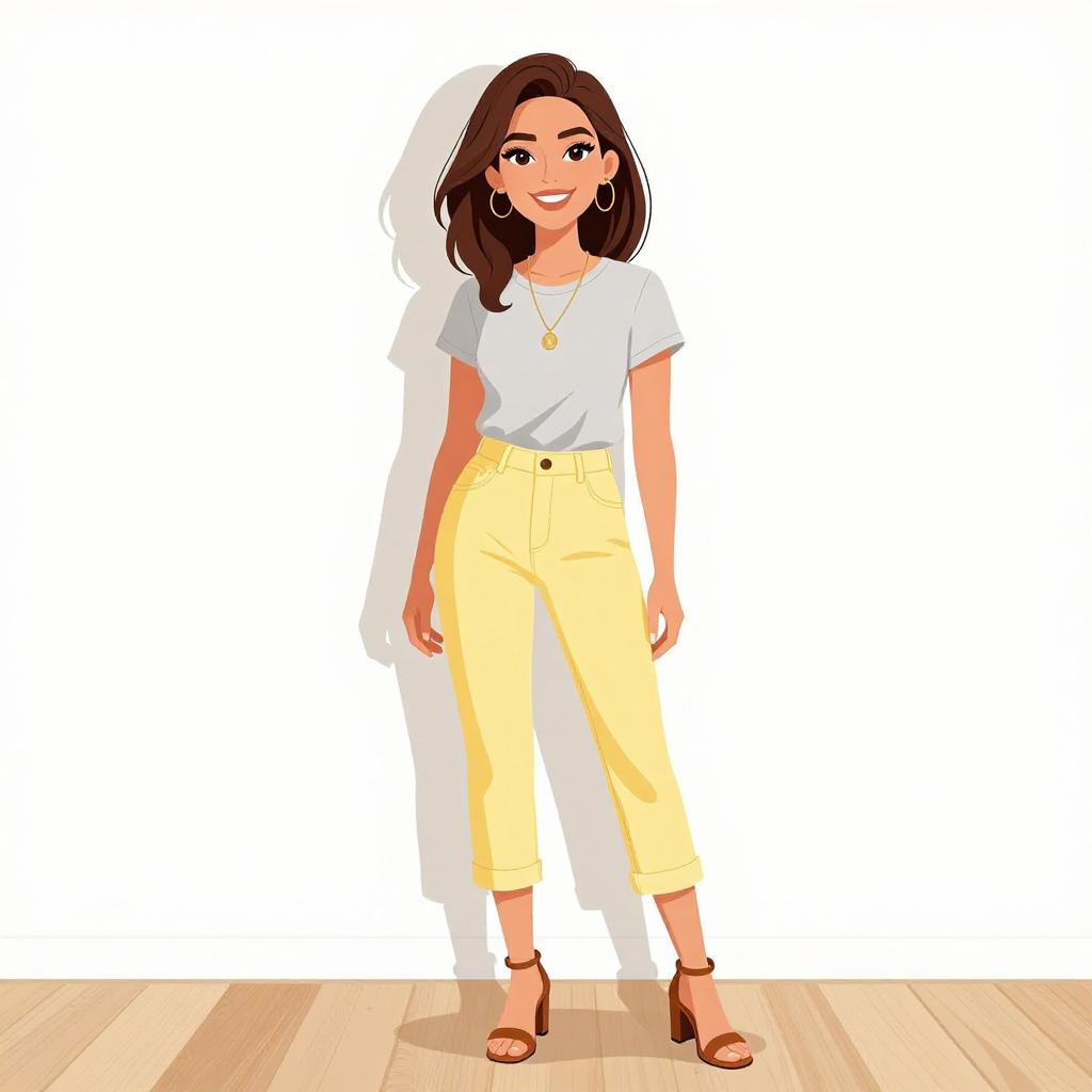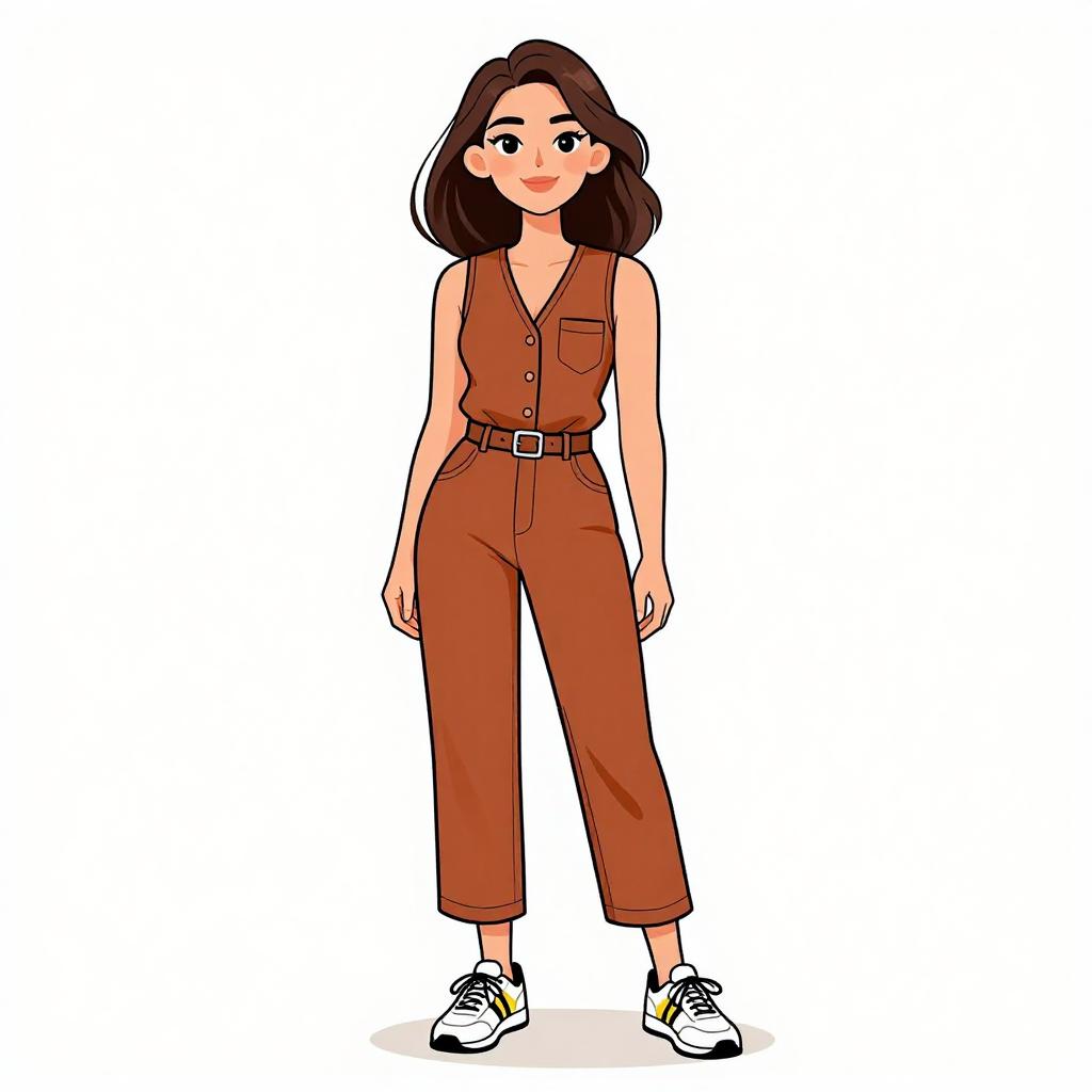 Woman with pretty face and pretty hair. smiling Woman, casual utility, mustard yellow boiler suit, long sleeves, button-up front, pointed collar, chest pockets with flap closures, fitted waist with belt loops, straight-leg pants, cuffed at the ankle, white leather low-top sneakers, natural makeup, loose hair, white studio background. --sref 1467