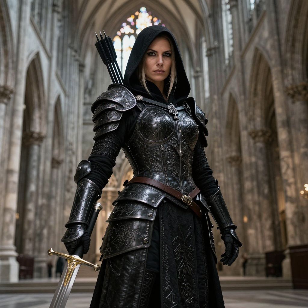 Digital art of a fierce female warrior in medieval black armor with a hood, standing in a grand Gothic cathedral, holding a sword and quiver.
