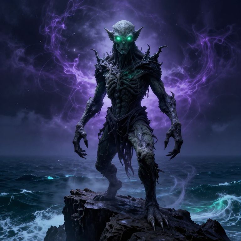 Digital artwork depicting a menacing, humanoid creature with glowing green eyes and sharp, pointed ears. The creature stands on a rocky cliff, surrounded by turbulent, dark blue ocean waves. It has a skeletal, muscular physique with tattered, dark clothing and clawed hands. Purple, electrifying energy swirls around its head, illuminating the ominous, cloudy night sky. The creature's texture is rough and jagged, contrasting with the smooth, glowing energy. The overall color palette includes deep blues, purples, and blacks, creating a dark, mystical atmosphere.
