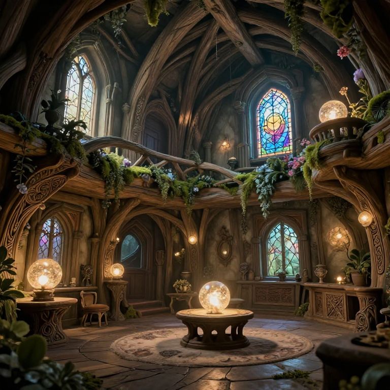 Photograph of a mystical, ornately decorated room with high, arched wooden ceilings adorned with vines and hanging plants. Four large stained glass windows with vibrant blue, red, and yellow patterns illuminate the space. Warm, glowing spherical lights are placed on circular wooden tables and a central round table, casting a soft light. The walls feature intricate carvings and arches, with potted plants adding greenery. The floor is made of large, stone-like tiles, and the overall atmosphere is enchanting and magical.