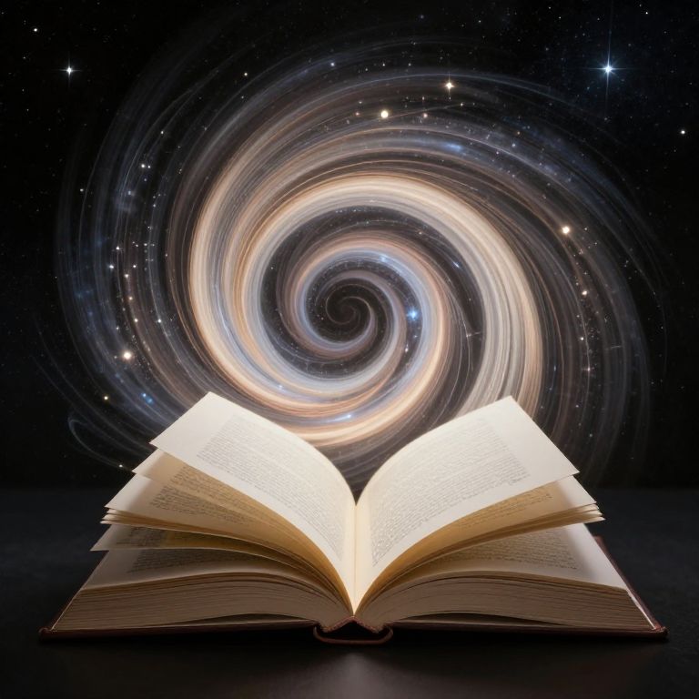 A colossal, open book with pages curling into an endless spiral forms a cosmic vortex, its parchment glowing faintly against the starlit void.