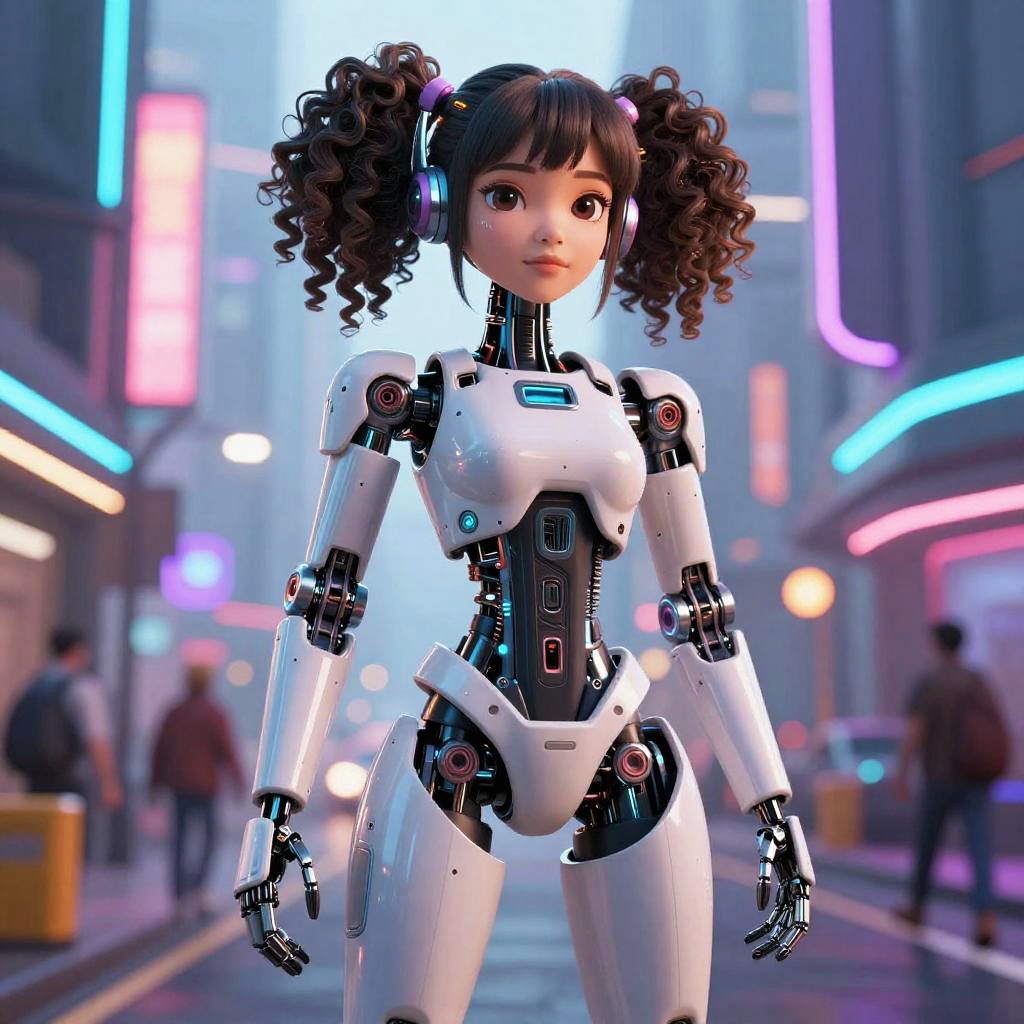 Photorealistic CGI image of a futuristic female android with silver, metallic, and shiny skin, standing in a magical, luminescent forest. She has curly, lavender hair, cat ears, and wears a black VR headset. Her body is adorned with glowing, blue and purple circuitry. She has purple, circular earphones and an intricate robotic chest plate. The background features glowing crystals, moss-covered rocks, and misty, ethereal light. The scene is vibrant with a mix of sci-fi and fantasy elements, creating a surreal, otherworldly atmosphere.