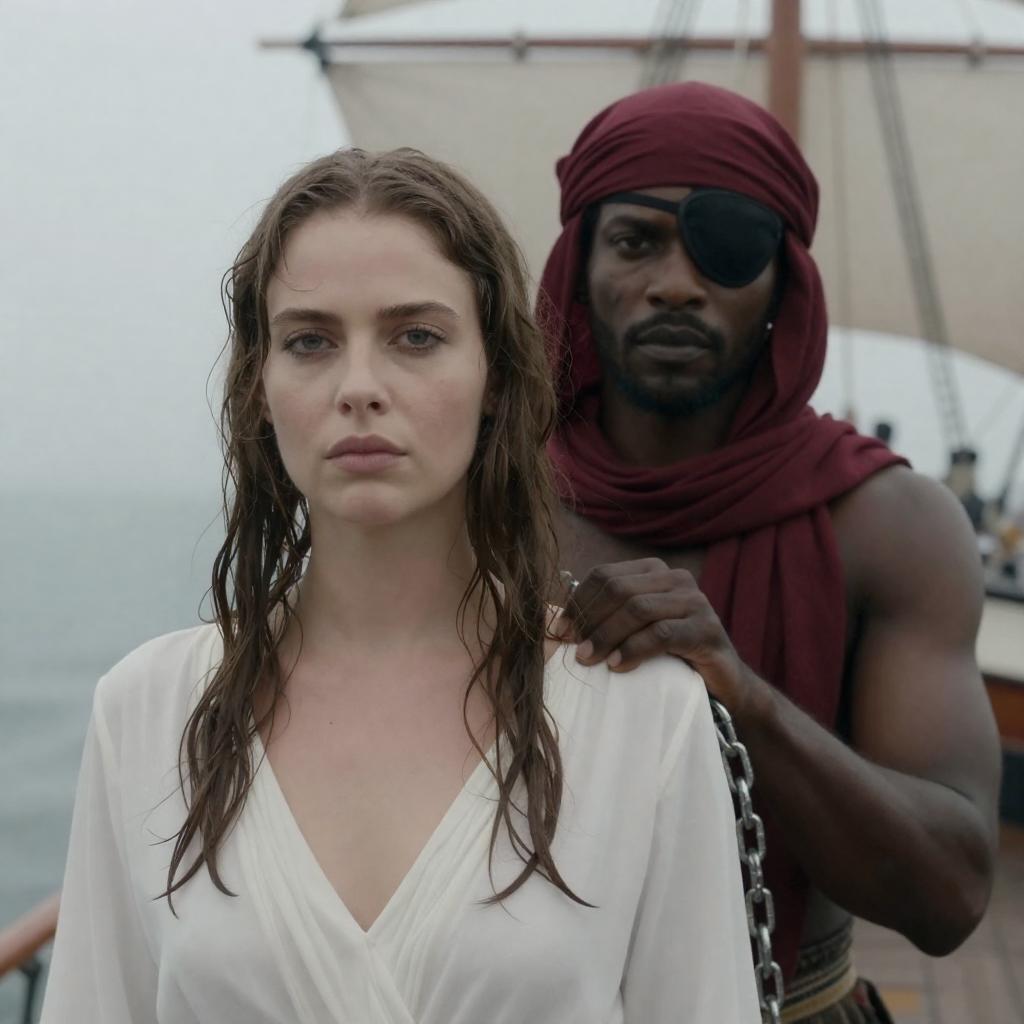 Photograph of a tense scene with a muscular bald Black man in a loincloth facing a group of dirty, disheveled people. A blonde woman in a white, torn dress stands to his right. Bald, bearded man gestures with his right hand. Background includes a crowded, smoky, rustic setting with various dirty, worn clothing. Facial expressions are intense and serious.