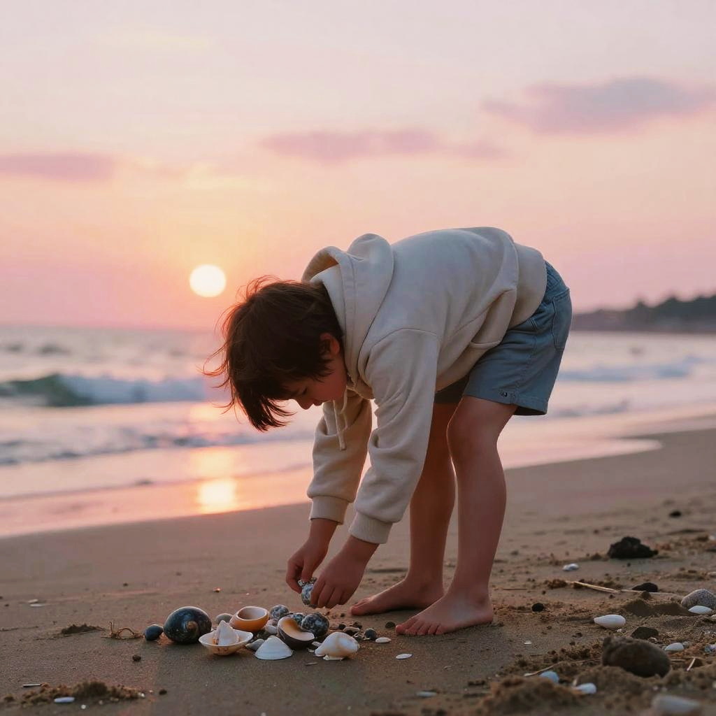 11 year old boy sitting on a driftwood log at the beach, sketching in a notebook, surrounded by seashells and small crabs, soft pastel sky at sunset with warm golden and purple tones, calm sea, relaxed and thoughtful expression, peaceful coastal landscape