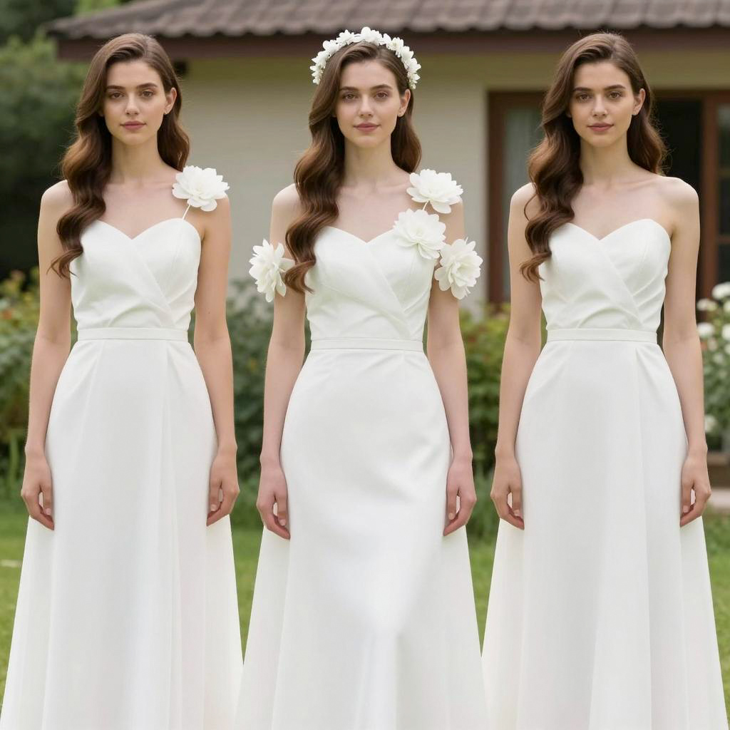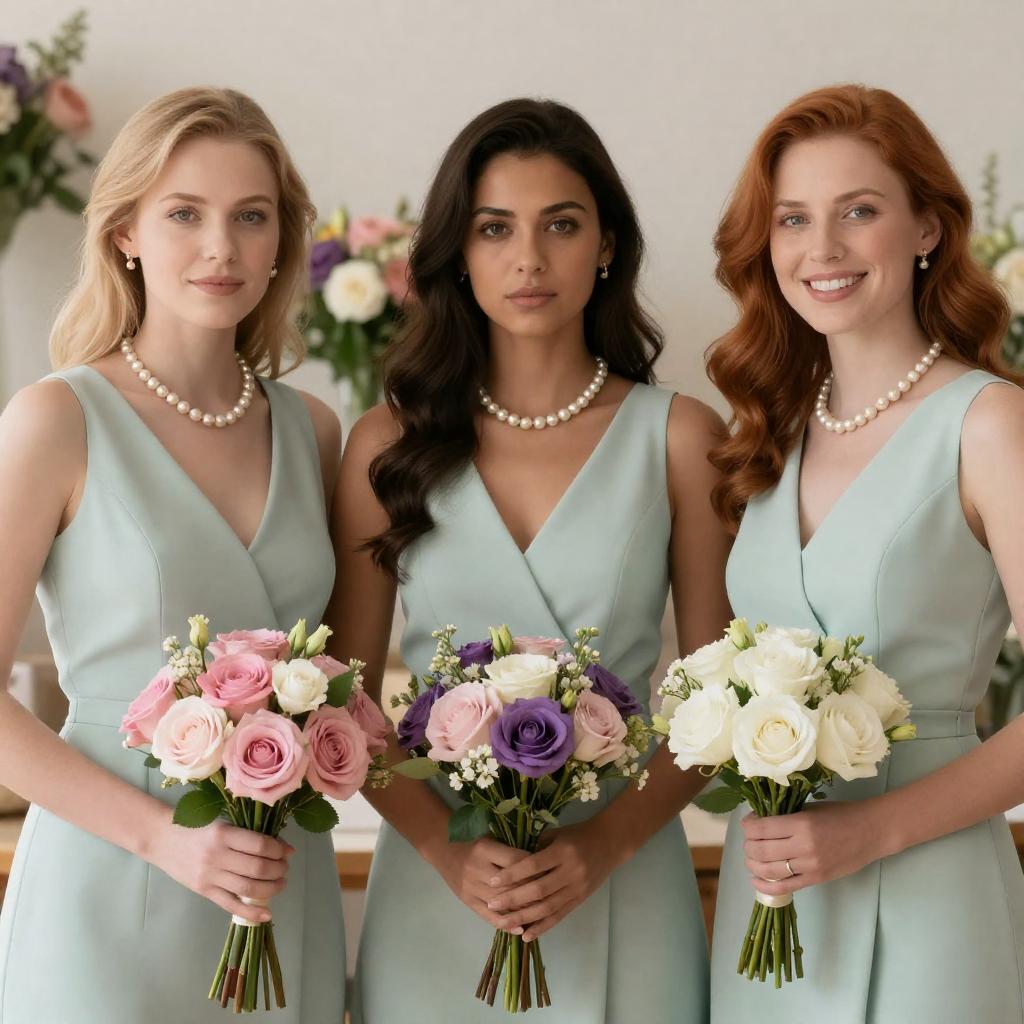 Three women in light green dresses and pearl necklaces, holding bouquets of pink, purple, and white flowers. Blonde woman on left, brunette woman in center with serious expression, reddish-brown haired woman on right smiling. Indoor setting with floral arrangements in background.
