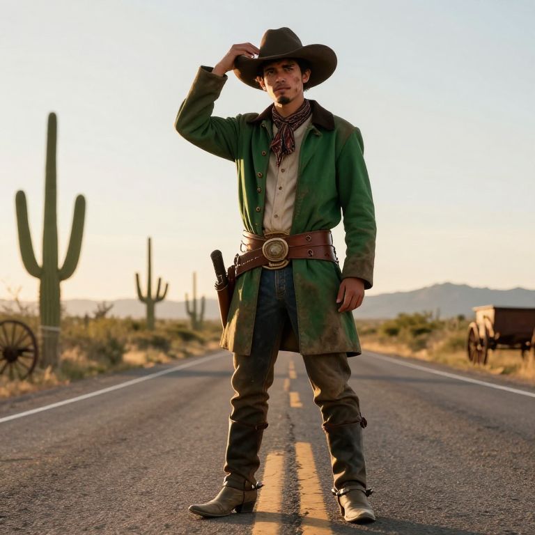 A young cowboy in wild wild west themed attire stands atop a dusty highway, his wide-brimmed hat tilted back, wearing a dusty green coat, spurs on his boots, and a leather sash tied tightly around his waist, his face showing a determined expression with dark, stubbled cheeks, realistic lighting with golden hour glow, surrounded by cacti and old wagon wheels in the landscape