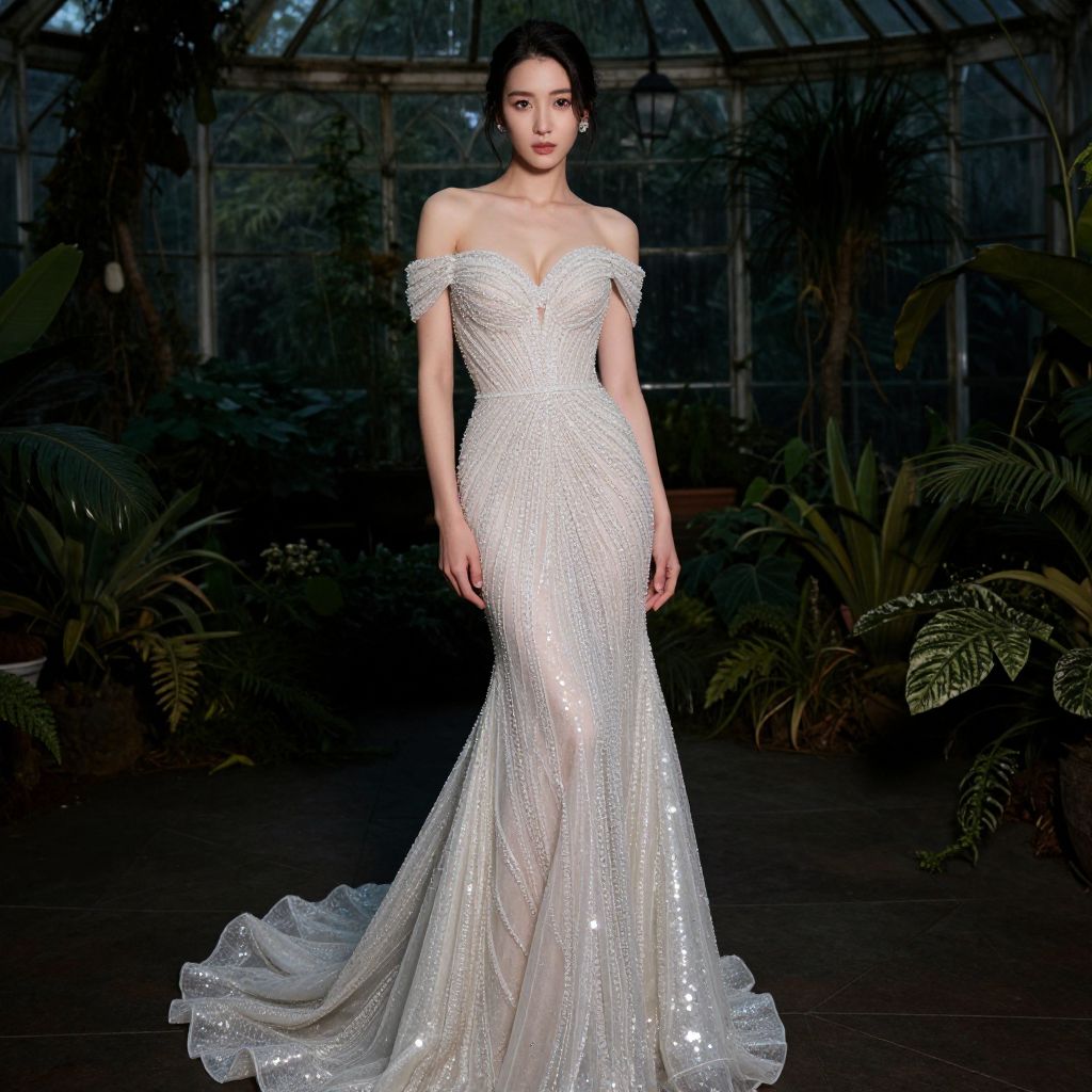 A woman, glamorous evening style, off-the-shoulder mermaid gown with intricate beading and sequins, sheer overlay, sweetheart neckline, fitted bodice, full floor-length skirt with a slight train, shimmering silver and white, simple stud earrings, elegant updo hairstyle, wonderland greenhouse with magical plants, low key lighting, deep shadows, mysterious feel Sexy. Pretty face and beаutiful eyes. Big breasts