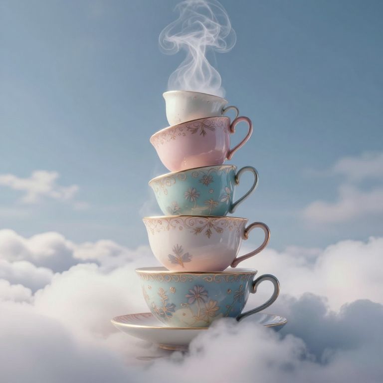 A whimsical tower of teacups ascends toward the heavens, its steaming summit dissolving into ethereal clouds, symbolizing the delicate balance between earthly desires and the boundless freedom of imagination.